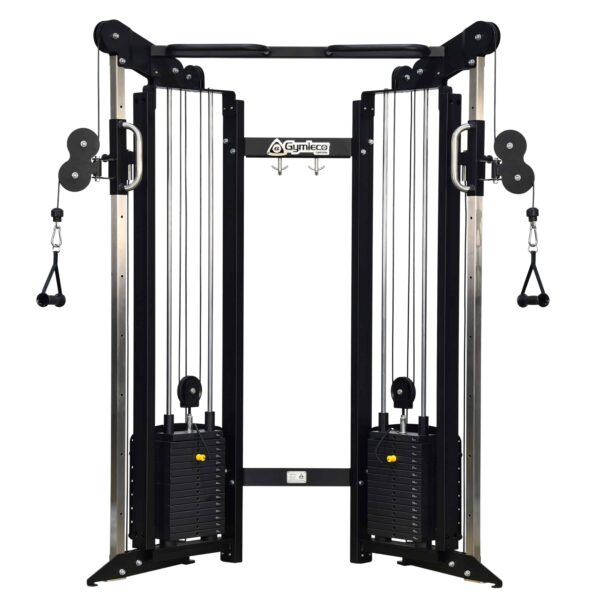 The Gymleco dual adjustable pulley, with 2×75 kg weight stacks, is a versatile, cost-effective tool for smaller gyms. This light commercial version uses cables instead of PowerBands and features a compact black frame, pull-up bar, and three pull handles. Its adjustable pulleys offer a wide range of training options